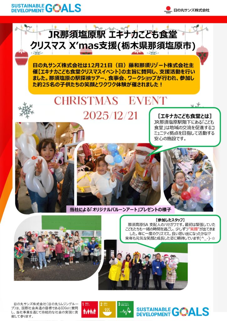 日の丸サンズ株式会社は12月21日、藤和那須リゾート株式会社主催【エキナカこども食堂クリスマスイベント】の主旨に賛同し、支援活動を行いました。当日は那須塩原駅探検ツアー、食事会、バルンアートが行われ、参加した約25名の子供たち、ご家族の元気な声と笑顔がたくさん集まりました!